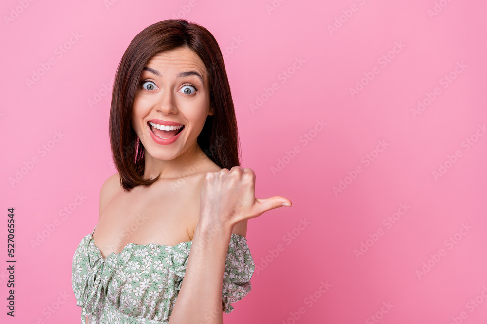 Adhesivo para pared Photo of adorable excited girl dressed off shoulders outfit pointing thumb back