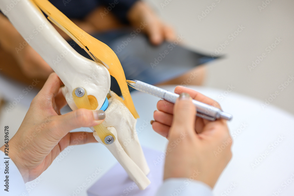 Adhesivo para pared An orthopedic surgeon demonstrates a knee bone model and explains the treatment of cruciate ligament injury using this model