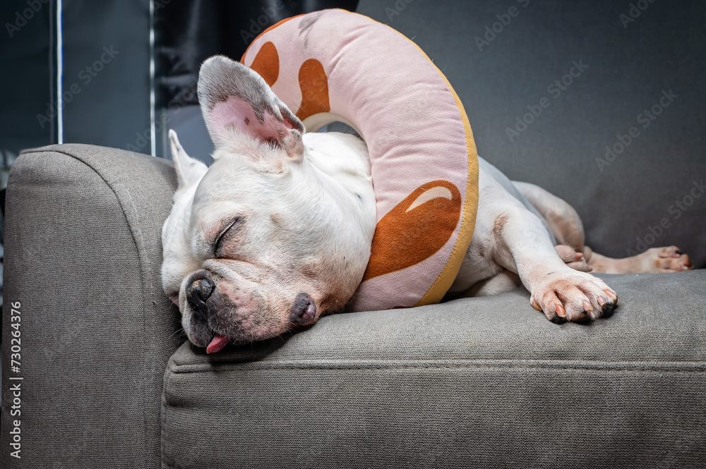 Adhesivo para pared A white French bulldog is sleeping comfortably on a gray sofa and has a cora worn around his neck to prevent scratching