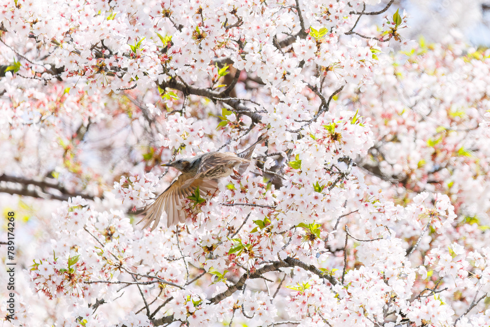 Adhesivo para pared 美しいソメイヨシノの間を飛び回って花の蜜を吸う美しいヒヨドリ(ヒヨドリ科)。 日本国東京都文京区、小石川植物園にて。 2024年4月撮影。 Lovely B