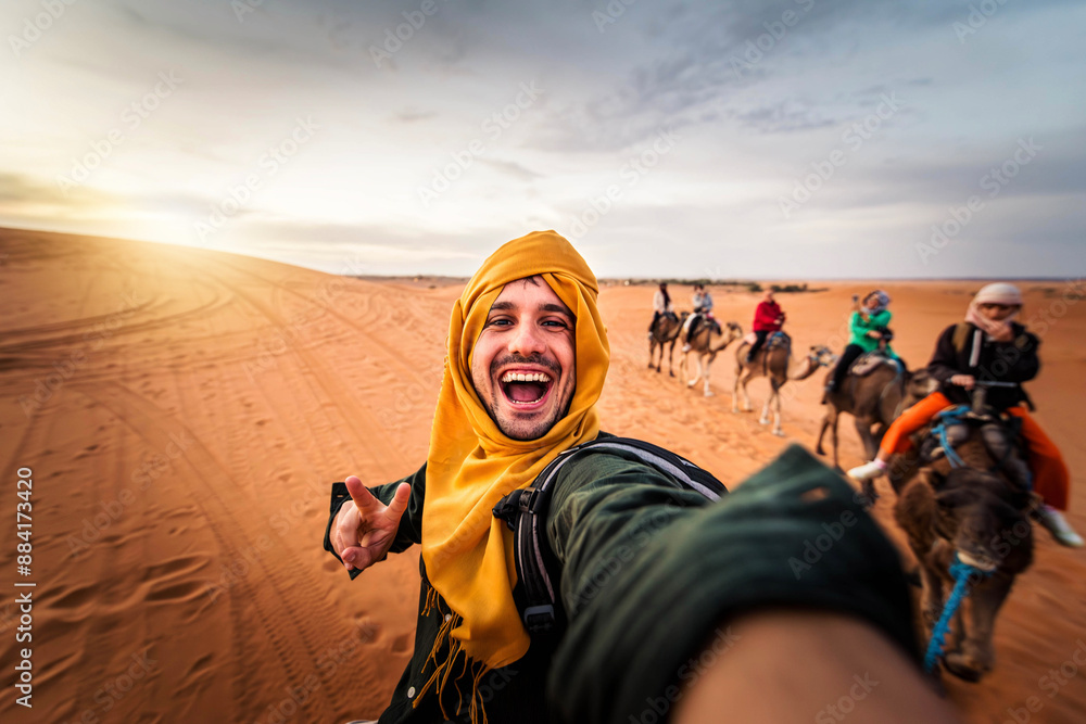 Adhesivo para pared Happy tourist having fun enjoying group camel ride tour in the desert - Travel,