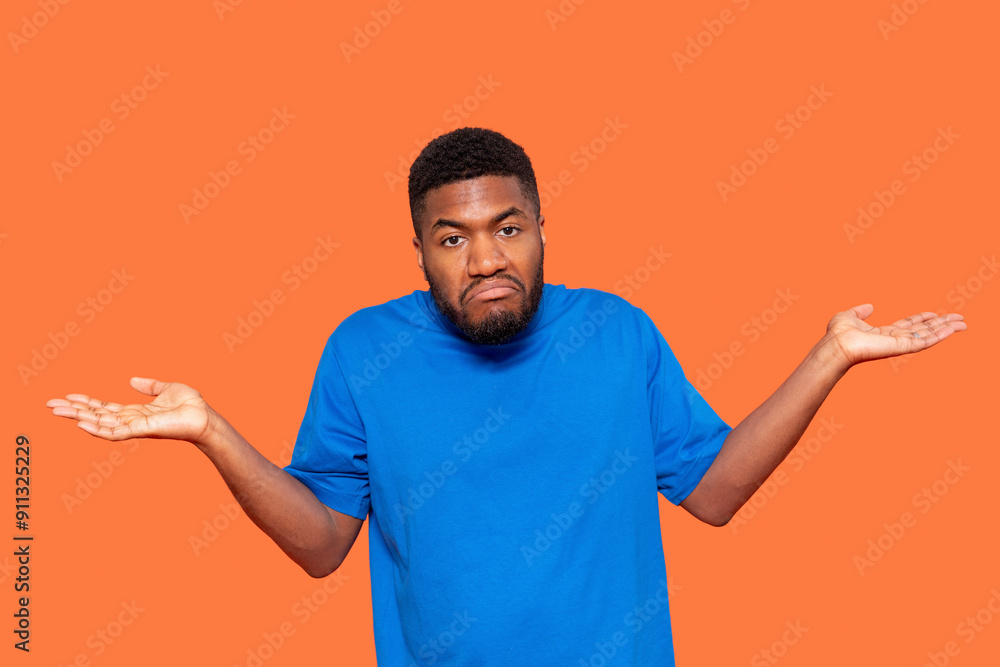 Adhesivo para pared Man Wearing Blue Shirt Shrugging Shoulders Against Vibrant Orange Background Dis