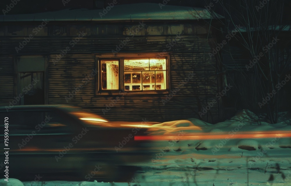 Fotografía Vintage Car Cruising Snowy Road at Night