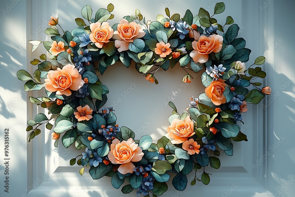 Fotografía Watercolor illustration of a heart-shaped floral wreath on a white door