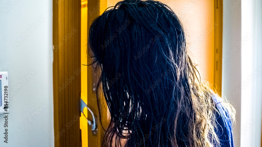 Fotografía Woman is ready for looking through the door gap / hole of her locked steel or wooden door