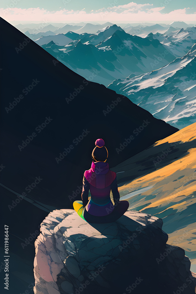Fotografía Woman meditating on top of a mountain. Generative AI