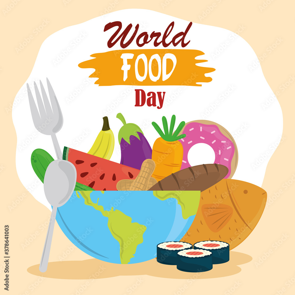 Fotografía world food day, full planet with various prdoucts fork and spoon, healthy lifest