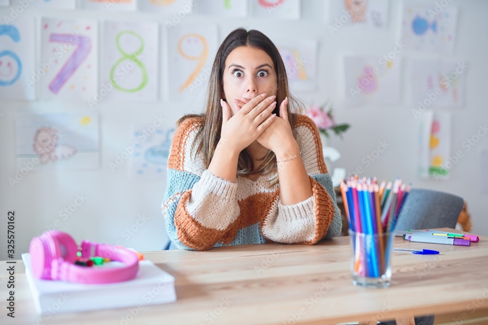 Fotografía Young beautiful teacher woman wearing sweater and glasses sitting on desk at kindergarten shocked covering mouth with hands for mistake