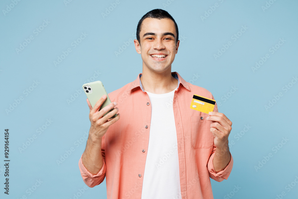 Fotografía Young middle eastern man wear pink shirt white t-shirt using mobile cell phone hold credit bank card doing online shopping order delivery isolated on plain pastel blue background