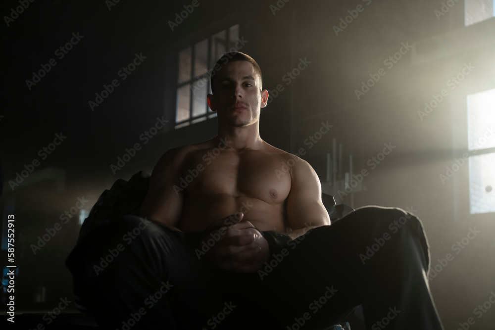 Fotografía Young muscular man with six pack abs sitting on a large tyre looking at camera i